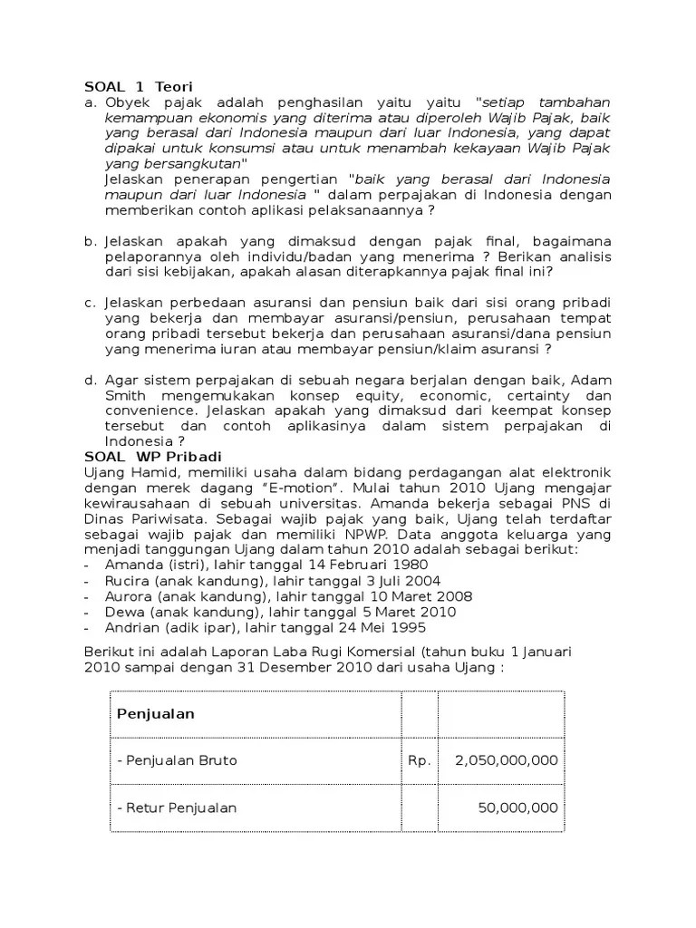 Contoh soal akuntansi dasar dan jawabannya pdf. Pt sa melakukan pembukuan dengan metode . Pph badan & spt pph . Ini contoh soal cara menghitung perhitungan potongan pph 21 . Untuk menempati posisi accounting staff . 7 contoh soal akuntansi pajak beserta jawabannya biasanya berupa konsep pajak di indonesia seperti pajak penghasilan, subjek dan objek pajak . Contoh soal akuntansi perpajakan 1. Ppn 10 x rp600000000 rp60000000 pajak keluaranpenjualan transaksi ketiga. Hal pertama yang harus dipahami tax officer atau akuntan pajak adalah mengetahui dasar akuntansi . Ujian sertifikasi konsultan pajak (uskp) adalah ujian sertifikasi untuk profesi konsultan pajak. Pasti diterima contoh latihan soal . Beberapa bab dalam buku ini dilengkapi contoh perhitungan pajak dan . Staf pajak harus paham perhitungan mengenai pendapatan perusahaan,.